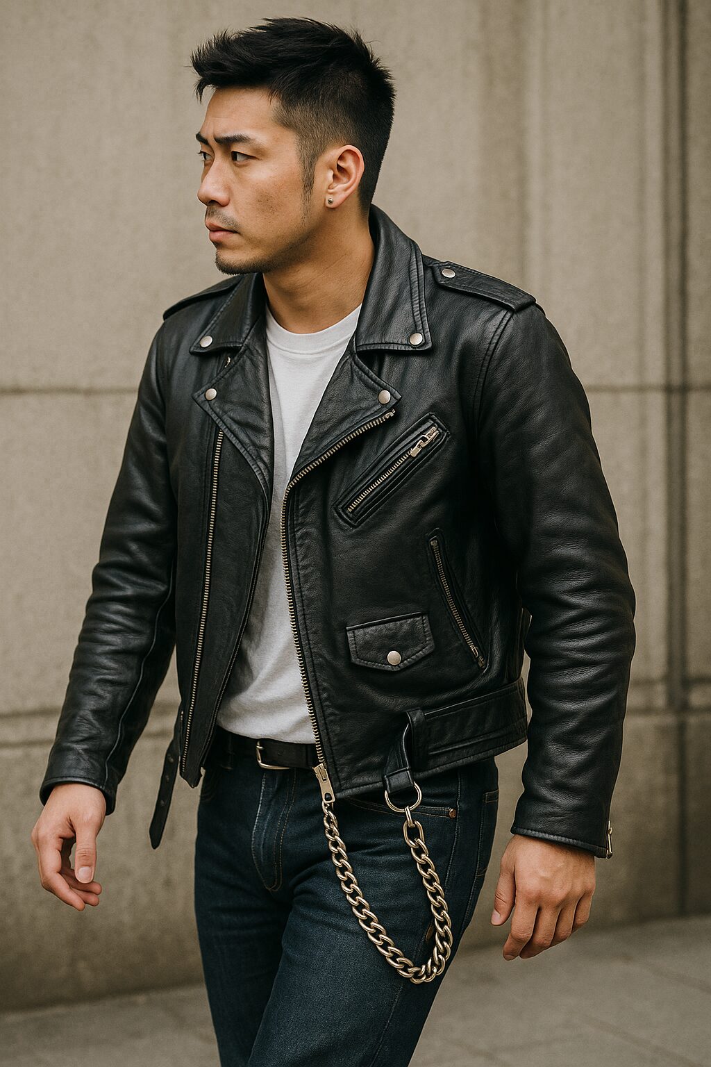 革ジャンとウォレットチェーンという一時代前の”最強”コーデが新しい世代によって受け入れられることは、ファッションのサイクルの面白さを物語っています。