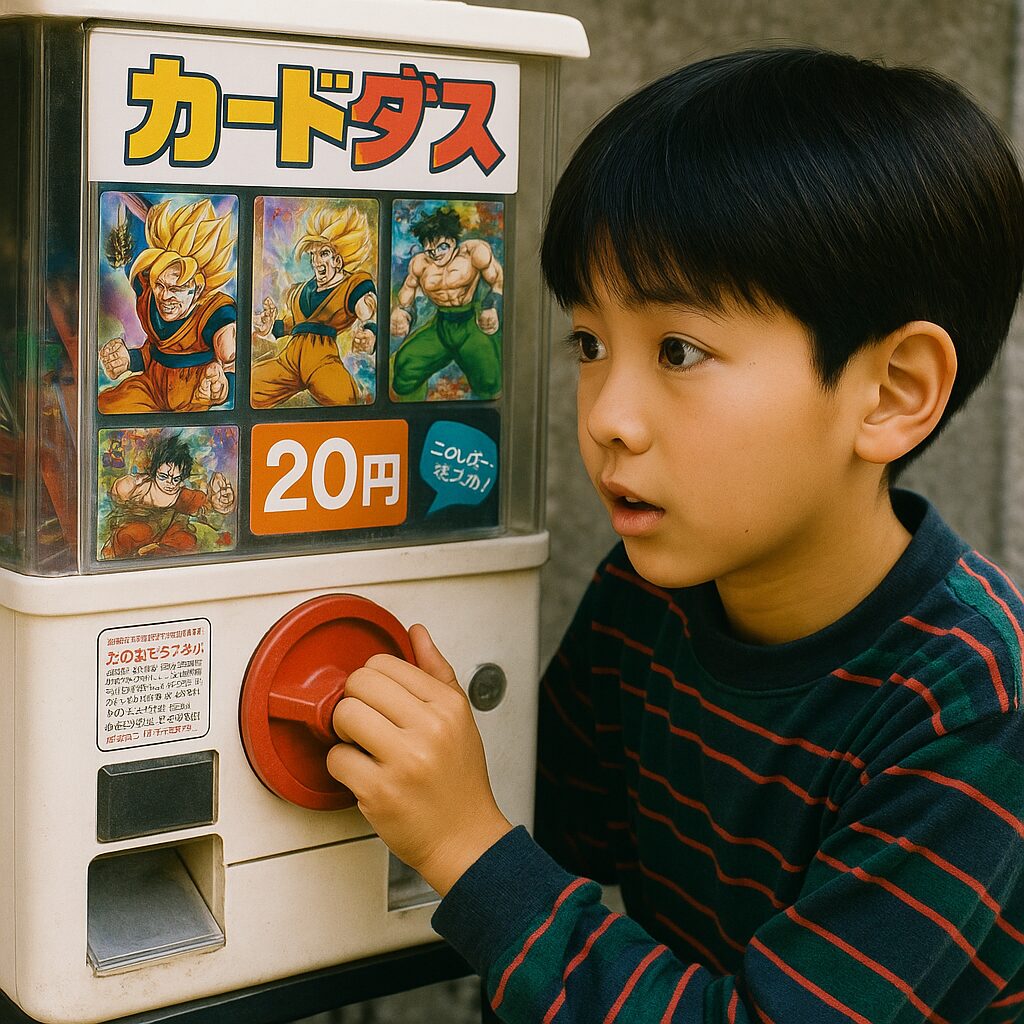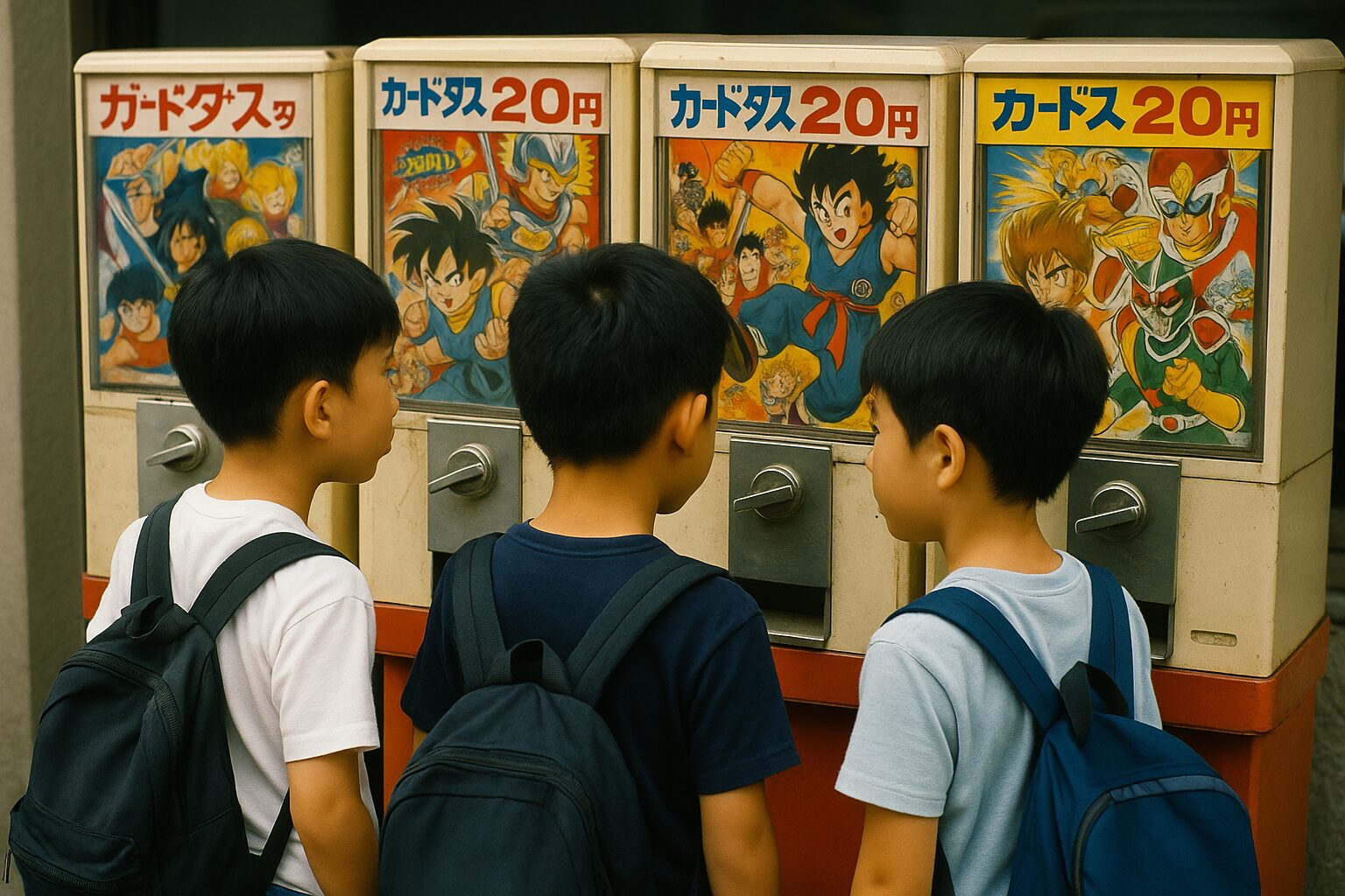 平成初期、カードダスの自販機を前にした子供たちは、ノーマルカードであっても特殊な魅力を見出していました。